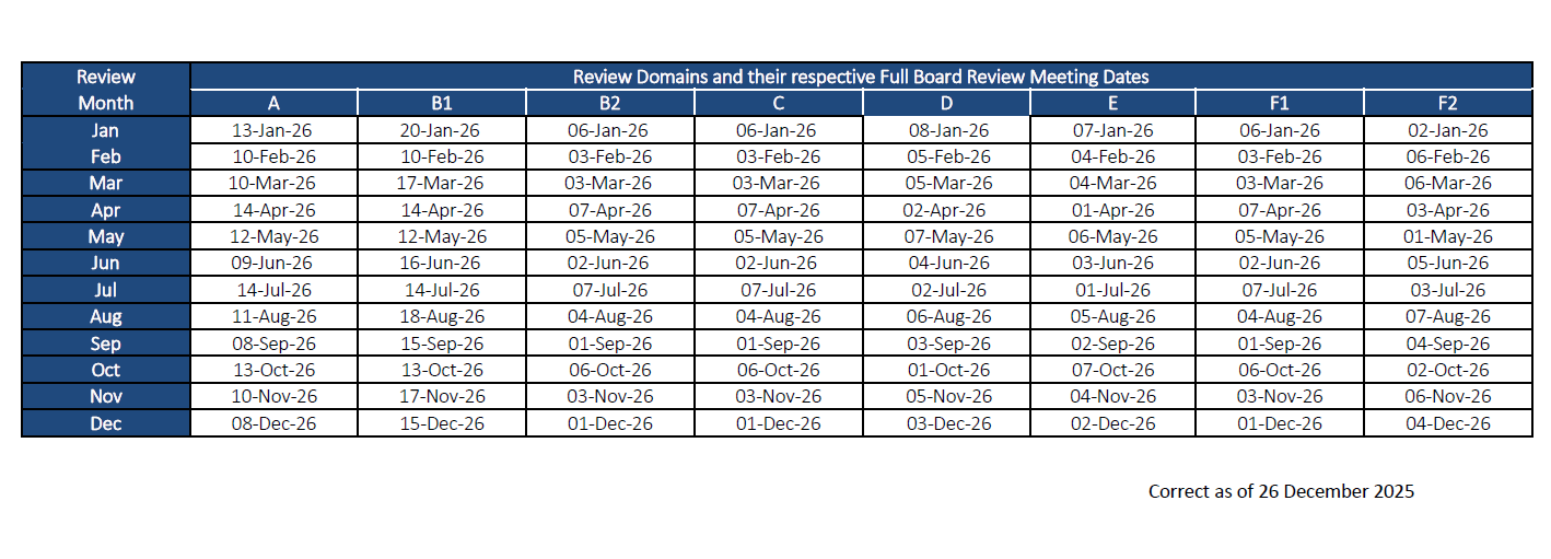 This is with the exception of Domain B1 whereby the submission deadline for Full Board studies would be on the 1st working day of the month or the next earliest working day if it falls on a weekend.