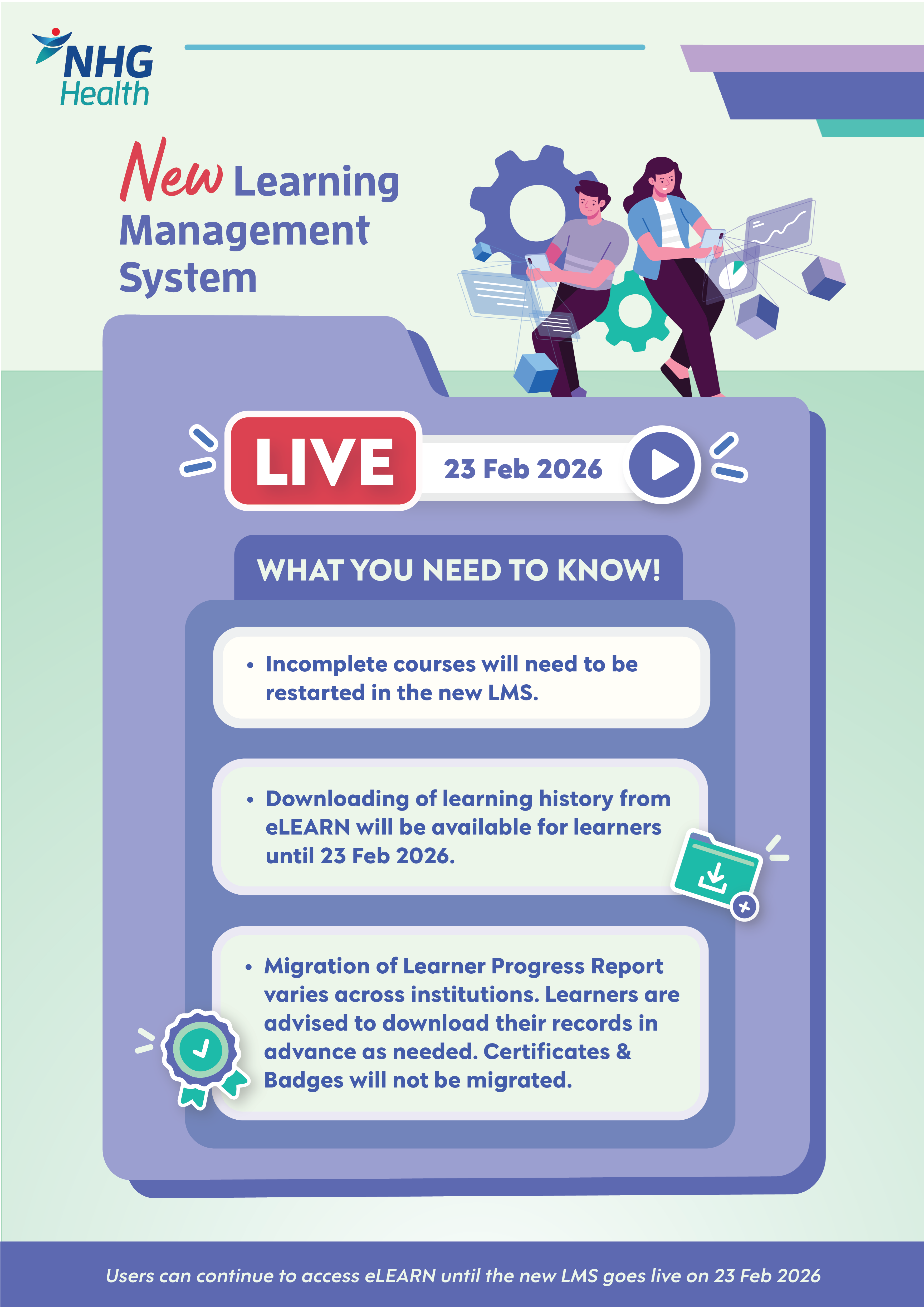 For assistance or enquiries, please contact the NHG Group eLEARN (Group) Administrator at nhggroup.elearn@nhghealth.com.sg.
